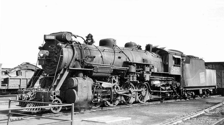 Frank Fabian, via Wayne Koch, contributed this view of Canadian National 2-8-2 No. 3450. The location, date, and photographer responsible are unknown. Formerly Grand Trunk No. 545 in class M, a Baldwin Locomotive Works product of 1913, she shared the specifications of other members of the S-1-f class and was scrapped in 1959.