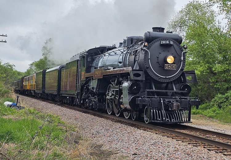 The lone survivor of the CPR's H1b class is No. 2816, which the railroad restored to operation in 2001 as the "CPR Empress" to highlight a public relations program. With a change in railroad management the steam program was suspended in 2012, but the locomotive was once again returned to service in 2023. Converted to burn oil, No. 2816 is equipped with positive train control for operation on main lines. Melissa Wagner captured this digital image at Kingston, Illinois on May 9, 2024 during No. 2816's run between Canada, the United States, and Mexico to celebrate the merger of Canadian Pacific and Kansas City Southern into the tri-national CPKC system.