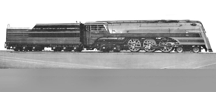 The Milwaukee Road's Chicago-Twin Cities Hiawatha proved so popular that longer trains were needed, beyond the ability of the class A 4-4-2s to handle. In 1938 the American Locomotive Company erected six class F7 4-6-4s to take over the service. No. 100 appears in this ALCo builder's photo. The F7s retained their streamlined shroud, designed by Otto Kuhler, to the early end of their service life in 1949-51.
