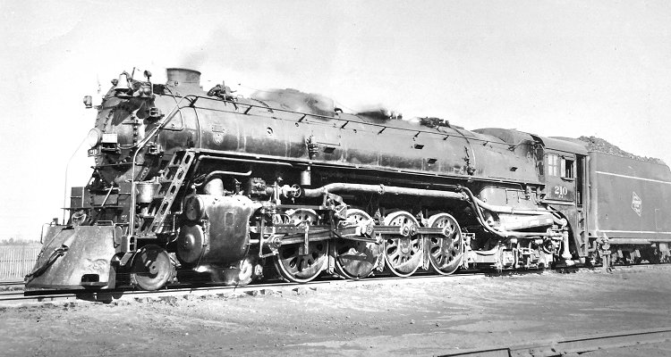 The Milwaukee Road's 4-8-4s of class S2 had a grate area of 106 square feet. They boasted an evaporative heating surface of 5509 square feet and a superheating surface of 2336 square feet. Other specifications are given on the previous page for No. 206. No. 210 appears here in a photo from the collection of Clifford "Mike" Southard, preserved at the Kishwaukee Valley Heritage Museum in Genoa, Illinois. The locomotive was retired at the end of 1954.