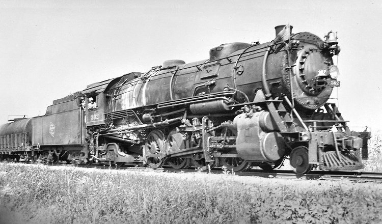 Mainstays of the Milwaukee Road's freight service prior to the introduction of the 4-8-4s were the 100 locomotives of class L3, 2-8-2s of the heavy USRA design. No. 302 appearing here at Linton, Indiana at an unspecified date, was erected in 1918 by the American Locomotive Company's Brooks works as No. 8610. With 63-inch drivers, she had 27x32-inch cylinders and produced 190 p.s.i. of boiler pressure. Locomotive weight was 320,000 pounds and tractive force 59,801 pounds. No. 302 belonged to a group rebuilt with a Delta trailing truck with a booster that raised the tractive effort to 62,949 pounds; these engines were reclassified to L3a. Other specifications are given on the following page for No. 306 of the class. The photo, included in the collection of Clifford "Mike" Southard, comes to our Archive courtesy of the Kishwaukee Valley Heritage Museum in Genoa, Illinois. No. 302 was retired and scrapped in 1953.