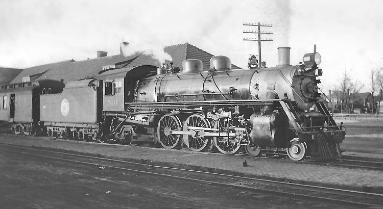 The Minneapolis & St. Louis billed itself as "The Peoria Gateway," a freight bypass around the congested Chicago region. Passenger service, however, was light and the railroad rostered only five Pacific types. In this view, acquired via eBay, 4-6-2 No. 501 has brought its train to a stop at an unidentified depot, date and photographer also unspecified. As a member of the K1-32 class, No. 501 was erected by ALCo's Brooks works in 1920. She had 69-inch drivers, a boiler pressure of 190 p.s.i., and 22x28-inch cylinders. Weighing 225,500 pounds, she developed 31,720 pounds of tractive effort. Evaporative heating surface was 2346 square feet with 560 square feet of superheating surface, and her grate area measured nearly 49 square feet. By 1949 all members of the class had been retired.