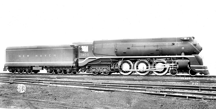 In 1937 Baldwin Locomotive Works delivered ten Hudson type (4-6-4) locomotives to the New York, New Haven & Hartford. These class I-5 locomotives with 80-inch drivers were assigned to fast passenger service between New Haven and Boston. Boiler pressure was 285 p.s.i. and cylinder dimensions were 22x30 inches. Weighing 365,300 pounds, they mustered a tractive effort of 43,968 pounds. Evaporative heating service totaled 3815 square feet and superheater surface 1042 square feet, with a grate area of 77 square feet. The I-5s had a cast integral frame and roller bearings on all engine axles. With early dieselization of the New Haven these classic Hudsons were withdrawn by 1951, retaining their streamlining till the end. No. 1400 was chosen for the Baldwin builder's portrait.