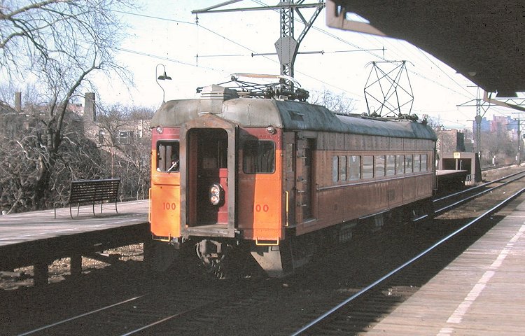 Another of the interurban cars delivered in 1926 by Pullman Car & Manufacturing, car 100 poses in Chicago for photographer David Leonard on February 28, 1971. This car, operating here as South Shore train 425, belonged to a group rebuilt during World War II; they were lengthened, made into combines (with an express door), and fitted with larger windows.