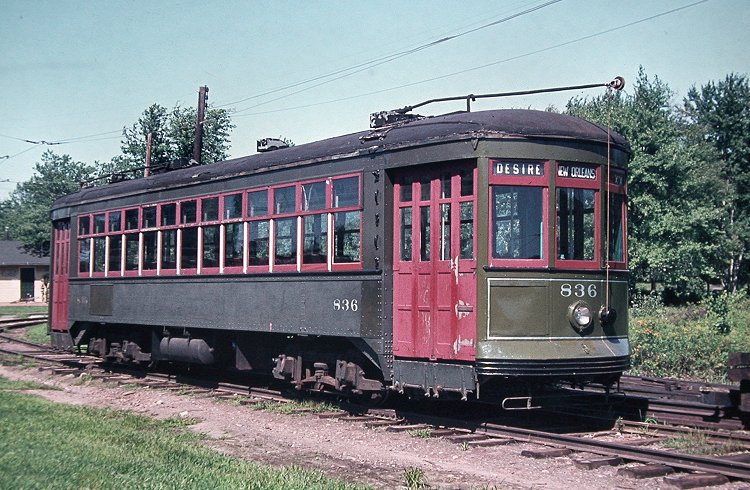 Perley Thomas Car Co. of High Point, North Carolina, constructed New Orleans Public Service car 836 in 1922. In New Orleans it operated in that city's 5 foot-2½-inch gauge, but was returned to its probable original standard gauge to operate at the Connecticut Trolley Museum, where I took this transparency in September 1968. The car ended its service in New Orleans, on the Canal Line, in 1964.