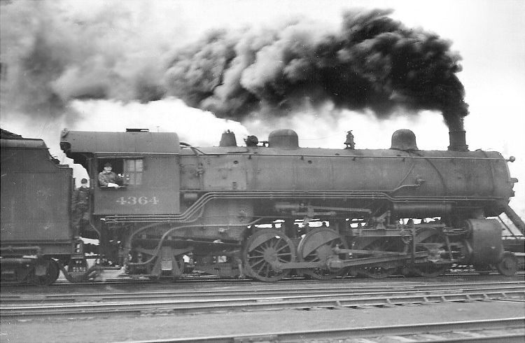 This "action shot" of Mikado No. 4364 of class Q-6, with Floyd Millinger at the throttle, was provided by his son Richard Millinger. The twenty engines of this class came off the Baldwin erecting floor in 1913 as the Chicago & Alton's L-2 class. They weighed 256,000 pounds and developed 51,000 pounds of tractive effort. They had 26x28-inch cylinders, 63-inch drivers and a boiler pressure of 200 pounds. With 4220 square feet of evaporative heating surface, they had 65 square feet of superheating surface and a grate area of 70 square feet. This photo was likely taken in Bloomington in the early 1940s. At that time at least some members of this class were being retrofitted with Worthington feedwater heaters, but in this view No. 4364 has not been rebuilt.