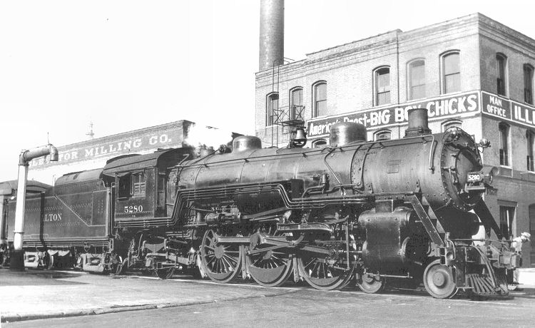 Alton No. 5280 belonged to class P-15. ALCo's Brooks Works outshopped these Pacifics in 1910 as the Chicago & Alton's class I-5A, numbered 625-634. They had 77-inch drivers and 23x28-inch cylinders, and sustained 200 pounds of boiler pressure. With a locomotive weight of 220,000 pounds they exerted a tractive effort of 32,800 pounds. This photo was provided by Gary Thompson of Normal, Illinois and was probably taken by Walter A. Peters.
