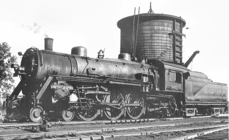 Shown at the water tank at Ridgely terminal, Springfield, is Alton 4-6-2 No. 5285 of class P-15. This engine's dimensions were the same as those of No. 5280 described previously. Note the Walschaerts valve gear in reverse position. In 1940 the Alton still rostered nine of the original ten members of this class. Walter A. Peters took this photo, from the collection of Gary Thompson.