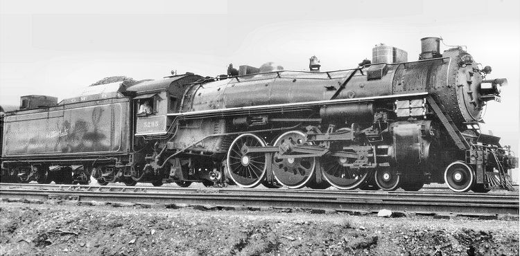 Walter A. Peters snapped P-16B Pacific No. 5295 at Ridgely, in Springfield, after the Alton Route had passed into GM&O ownership; note the tender lettering for both railroad names, as on Nos. 5294 and 5296. Several features of the 1943-44 modernization, as described for No. 5296, are evident. Additionally, her tender has the head brakeman's "doghouse" over the water tank, similar to that found on the Alton's freight locomotives; several of the P-16B engines received this feature after diesels displaced them in passenger service so they could run out their modernization costs in local freight service. No. 5295 was torched in 1950.