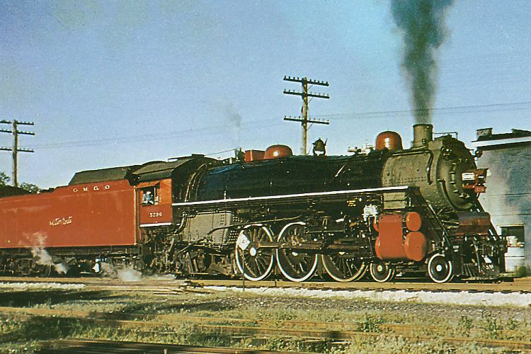 In this rare color view by Cedric Prusia, from the Richard R. Wallin collection, the freshly shopped 4-6-2 No. 5296 leaves Brighton, Illinois with a southbound local in March 1947. The image was scanned from Don Ball, Jr.'s America's Colorful Railroads, published by Bonanza Books in 1978 and now out of print. This also appears to be the image on the cover of the GM&O Historical Society Magazine No. 17 (1978). No. 5296 is shown here during the brief time after 1947 when she operated with GM&O lettering on the tender. Originally the C&A's No. 656, she was apparently the last of the P-16s to be scrapped, surviving till December 1951.