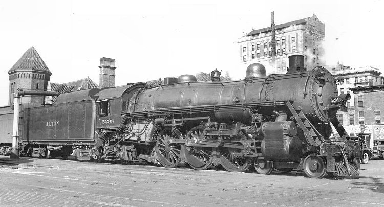 Pacific No. 5298 was originally the Chicago & Alton's No. 659 of class I-6. In this view by Walter A. Peters of Springfield, Illinois we see her at the depot in Springfield before being modernized to the 1943-44 specifications of the P-16B class. Gary Thompson of Normal, Illinois provided this photo.