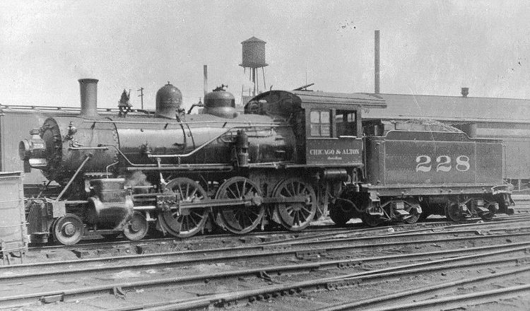 Little is known about this Chicago & Alton 4-6-0 or Ten-Wheeler type locomotive, shown here in a photo from Gary Thompson's collection. It was probably a member of the Chicago & Alton's G-2 class, erected before 1900. The C&A's earlier 4-6-0 classes had 64-inch drivers and carried 175 pounds per square inch of boiler pressure. If this engine belonged to class G-2 its cylinder dimensions were 18x24 inches. By 1940 all Ten-Wheelers were off the Alton Route roster. Photographer, date and location are unknown, although the old headlight (perhaps not electric) points to a time no later than the early 1900s.