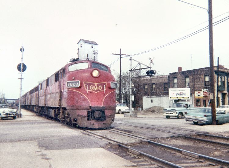 Blocking traffic on Washington Street, EMD E7 unit 102A brings The Limited to a stop at Bloomington on its Chicago-St. Louis run. This photo from the collection of Gary Thompson is dated May 1965, but the photographer is unidentified.