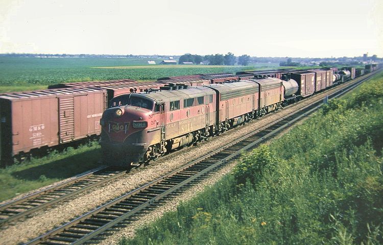 Northbound freight No. 28 with EMD F3A unit No. 801A in the lead is about to leave the Bloomington yard limit on its way to Chicago, passing a string of ex-Alton 40-foot box cars. The date is July 1964. In the summer's hazy distance we can make out a few of the ISNU dormitories. This photo appeared on the front cover of the GM&O Historical Society's 2005 Calendar