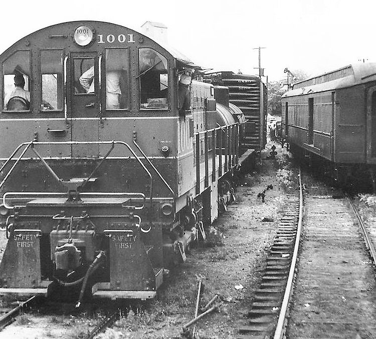ALCo switcher No. 1001 shoves a cut of cars northward around the wye track leading to the main line and yard. Perhaps they are being spotted on a transfer track for the Nickel Plate or Peoria & Eastern. The view is from the rear platform of the motor train on June 10, 1959. A mail and express car and, apparently, some maintenance-of-way equipment are blocking the tracks to the north, so the motor train must have backed onto the platform track after coming down from the terminal.