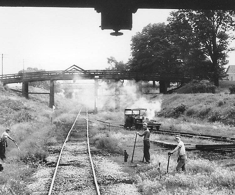 Approaching the stop at Delavan, we pass a section gang doing track work (note the fresh ballast). Viewer Harry Bryan identifies the black object in front of the middle worker as a track jack. The gang has parked its speeder and trailer on the wye track connecting to the Illinois Central's Pekin and Peoria area branch, and a small fire is burning behind the speeder. The overpass in the background would be Illinois Route 122, while the nearer overpass carries a local street.