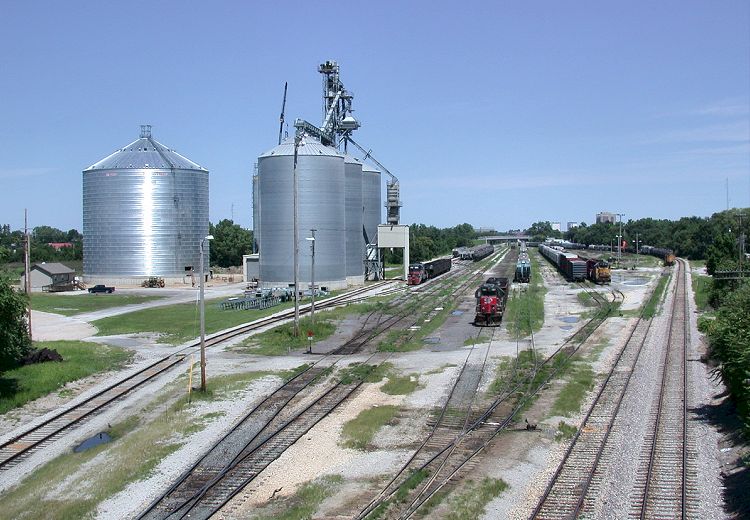 The once-busy yard has become a resting place for idle switching units in this scene photographed on August 12, 2006. In place of the locomotive servicing facilities and shops we see what appears to be a large grain processing facility. |