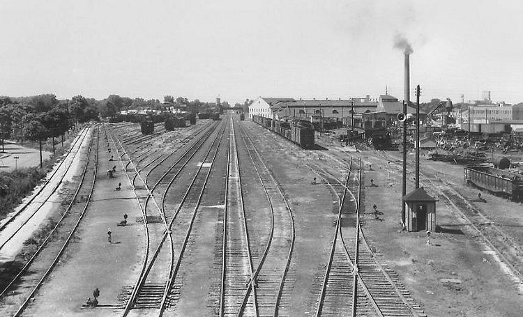Having acquired my first 35mm camera in 1957, I was eager to test its capabilities. One of my first shots was this view of the Bloomington yard from the Emerson Street bridge. Note the loudspeaker mounted on the pole at right. Before switching crews had radio equipment, the yardmaster directed their activities through this P.A. system. On a still summer night, with windows open in pre-air conditioning mode, neighboring residents were privy to the niceties of round-the-clock yard operations. With a slight westerly breeze, the sound of crashing couplers could be heard as far as our home, seven or eight blocks east of the yard. For a view of this scene in 2006, click here.
