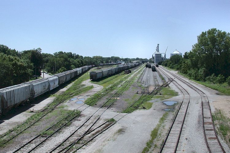The yard is overgreen with grass and weeds in this August 12, 2006 view. A diesel unit and a cut of grain cars are resting over the weekend on the former southbound track, at left, the passenger bypass having been reduced to a single track. Gone are the shop buildings and piles of salvaged parts.