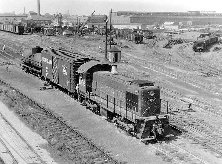A "fallen-flag" duet as GM&O ALCo S2 No. 1002 hustles a Rock Island box car and an unidentified tank at the north end of the Bloomington yard in July 1957. |
