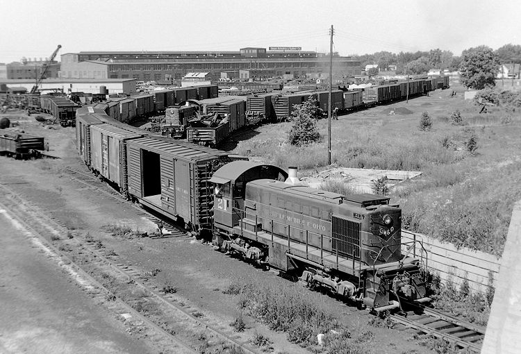 ALCo S2 No. 21 switches sidings at the north end of the Bloomington yard, in the area adjacent to the Union Asbestos & Rubber plant. Road switcher No, 1122 (see next photo) joins the action in the background. Although the plant was operating in the 1950s, it appears that the area was used mainly for the storage of railroad materials and scrap metal. This scene was photographed from the Emerson Street bridge in June 1957. Click here to view this location as it appears today.