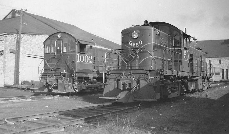 Members of Bloomington's switching fleet pose next to the diesel house in this scene from March 1957. In my mind I can still hear the familiar sound of these smoky ALCo units coursing back and forth through the terminal area. No. 1002 is an ALCo S2 switcher and No. 50 is an RS1 road switcher. Both units were retired by 1975.