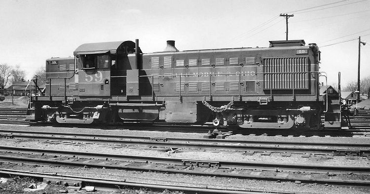 Here is a broadside view of ALCo RS1 No. 59, snapped in the yard in April 1958. The RS-1 had the six-cylinder ALCo 539 engine, with its whistling sound produced by the turbocharger. The box-like appliance with the stack just ahead of the cab is an oil-burning heater to keep the engine crankcase oil warm, allowing the engine to be shut down in cold weather; three GM&O ALCo road switchers had this device. No. 59 operated until 1974.