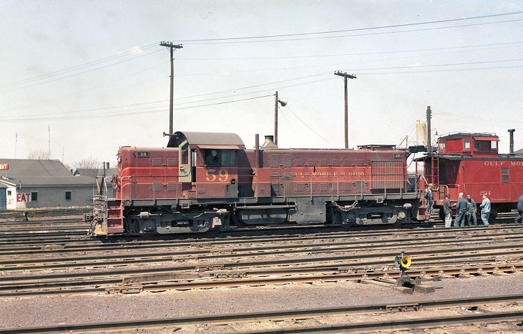 My brother, David V. Leonard, took this color image of ALCo RS1 No. 59 in the yard on April 26, 1958. It appears to be involved in some sort of caboose or crew movement. Perhaps the men have just come from "beans" at the establishment to the left.