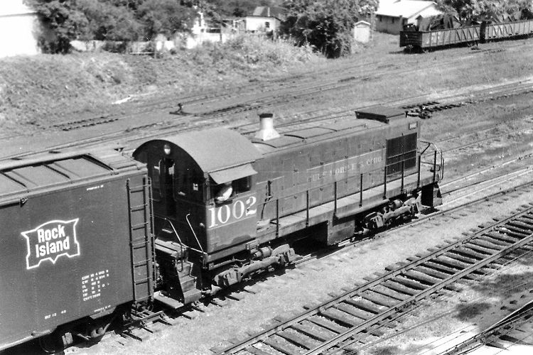 ALCo S2 switcher No. 1002, with its Rock Island boxcar, has pulled under the Emerson Street bridge in this July, 1957 view.