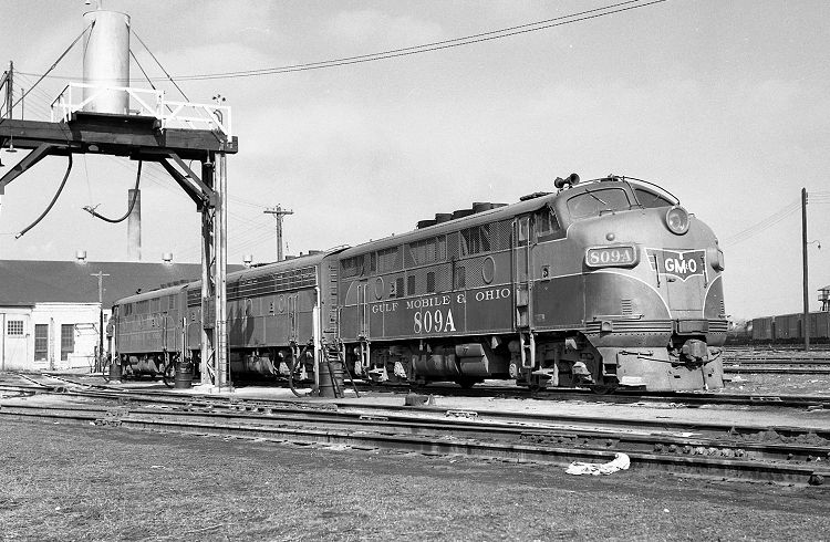 EMD F3A unit 809A idles in the terminal area together with unidentified B and A units. The photo, dated February 1958, comes from my brother, David Leonard. No. 809A was retired and scrapped in 1977.