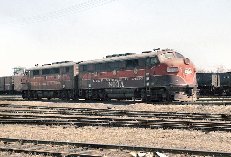 My brother snapped this color shot of F3A unit 803A and an unidentified companion resting in the Bloomington yard on April 26, 1958. The yard tower is in the background, at left.