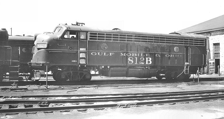 The carbody of EMD F7 unit No. 812B sits outside the diesel house resting on freight car trucks in April 1958. The unit was removed from the roster in 1977 and rebuilt into an FP10 by Morrison-Knudson; it then saw service as the Massachusetts Bay Transportation Authority's No. 1104 until being sold for scrap in 1993.