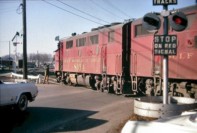 A waiting car casts a morning shadow on West Washington Street as an operator hands up train orders to a freight swinging onto the Jacksonville line. My brother David took this transparency in November 1969. According to viewer Bob Oliver, who worked at the Bloomington Union Station during the time this photo was taken, the train is likely to be the Jacksonville local, which left in the morning on alternate weekdays. There was also an East Peoria-Bloomington turn that ran to Bloomington at night and returned to its base terminal, the Peoria & Pekin Union facility in East Peoria. The train made the connection to the East Peoria line over the wye track north of San Jose. Since that tran ran during the hours of darkness, any photos of it must be rare. (Thanks to David P. Jordan for the background information on the Peoria train operations.)