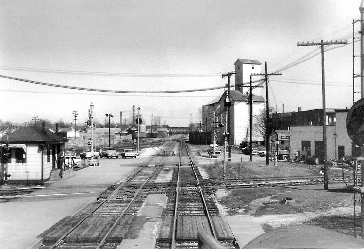 Leaving the Bloomington station, we are about to cross the diamonds of the New York Central's Peoria & Eastern branch and the Nickel Plate's Peoria line, running side by side through Bloomington. Passenger trains of the P&E formerly stopped here until their discontinuance in 1957. The building at left, guarding the crossing, was known as "BN Target." This crossing was not an interlocking; all trains had to stop to obtain clearance. The Washington Street crossing is beyond the diamonds, and the Locust Street overpass is visible in the distance beyond the wye track leading to the Jacksonville line, and the transfer track to the NKP and P&E.