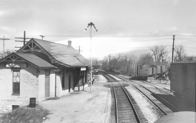 Rounding a curve, we pass the station at Wilmington, not a passenger stop. Note that we are now on single track (the track at right is a siding). The GM&O split at Mazonia, with the western line (used for freight) joining the Santa Fe at Coal City and rejoining the GM&O south of Joliet. Both tracks are still in use by Union Pacific.