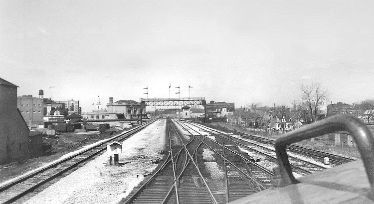 The Abraham Lincoln prepares to stop at the landmark Joliet Union Station, shared with the Santa Fe (merging from left) and the Rock Island (crossing at the depot; note the interlocking tower at right). |
