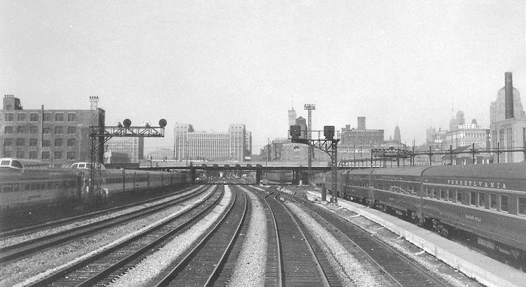 The schedule calls for the Abraham Lincoln to arrive in Chicago at 2:08 p.m. Passing through the coach yards, we see passenger equipment of both the Burlington Route and the Pennsylvania Railroad. The vista domes mark the cars on the left as belonging to the Burlington's California Zephyr, which was scheduled to arrive in Chicago at 2:05 p.m. and depart at 3:10 (our train must be running a bit late.) The Pennsylvania equipment may be for The General, set for a 3:15 p.m. departure for New York. The 1960s Chicago skyline at right lacks, among others, the Sears Tower, which was not erected until 1974.