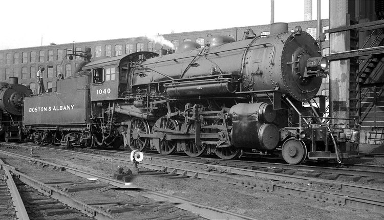 Boston & Albany Consolidation No. 1040 appears in an image from 1949, only a few months before she was retired and sold for scrap. 1908 products of ALCo's Schenectady words, the class G-6h 2-8-0s featured 23x32-inch cylinders, 63-inch drivers, and a boiler pressure of 200 p.s.i. They weighed 242,000 pounds and developed 45,660 pounds of tractive effort. No. 1040 was delivered as No. 2640 in the NYC&HR series, but was renumbered to B&A 1040 in 1912. No information is available concerning the location of the photo, or the photographer.