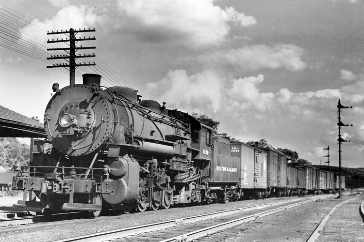 James W. Bennett photographed B&A 2-8-2 No. 1200 at Chester, Massachusetts, in the late 1940s. She was the first of fourteen members of class H-5j delivered by ALCo's Schenectady Works in 1914. Like most 2-8-2s these engines had the conventional 63-inch drivers, with 25x32-inch cylinders and 180 p.s.i. of boiler pressure. Their locomotive weight was 283,500 pounds and they produced 48,570 pounds of tractive effort augmented, after retrofitting with a booster, by another 8,990 pounds. No. 1200 was cut up in 1950 and hence was not renumbered into the NYC sequence in 1951, as were seven other members of her subclass. William D. Volkmer acquired the image from the Rail Photo Service and provided it for our New York Central Collection.