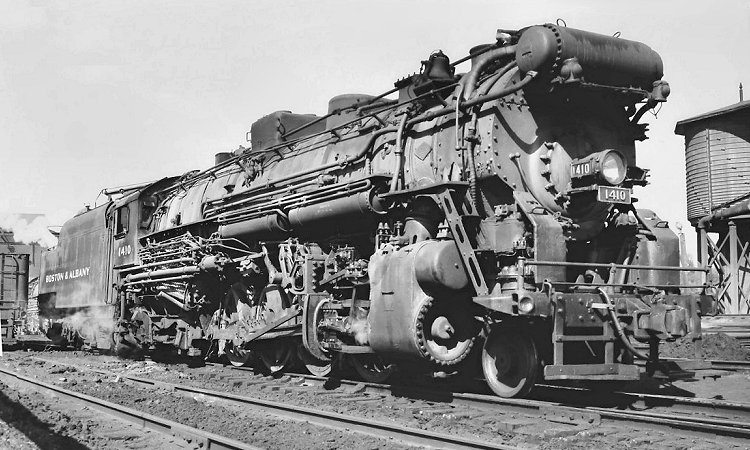 B&A Berkshire No. 1410 is shown here at West Springfield, Massachusetts, on September 15, 1946 in an image, photographer unspecified, that came to our NYC Collection from Carl Weber. These members of class A-1a weighed 389,000 pounds and developed 69,400 pounds of tractive effort, with a booster bringing the total to 81,400 pounds. Other specifications appear in the commentaries for Nos. 1408 and 1441. With the progress of B&A dieselization this locomotive was transferred to the New York Central's other eastern lines in 1948. However, it saw only a brief service life there, being retired and scrapped the following year. Ironically the original Lima demonstrator, No. 1, became the Illinois Central's No. 7050 (renumbered to 8049 in 1941) and outlasted all the B&A Berkshires, being scrapped in 1954.