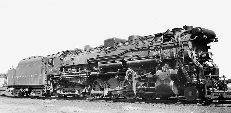 B&A 2-8-4 No. 1439 appears here in an image from the collection of Carl Weber. Location and cameraman are not specified, but the photo dates from the mid-1930s before the original eight-wheel tenders of these class A-1b Berkshires had been supplanted by twelve-wheel tenders salvaged from other locomotives. The array of external piping, squared sand dome, and prominent Elesco feedwater heater contribute to the impression of brute power conveyed by the earlier B&A Berkshire classes — power that was, indeed, the rationale for their design and construction as maulers of the heavy grades over their namesake mountain range. No. 1439 apparently remained on the B&A roster through her entire service life, and was not one of the Berkshires transferred to other parts of the NYC System during and after World War II. She was removed from the roster and scrapped in 1949.