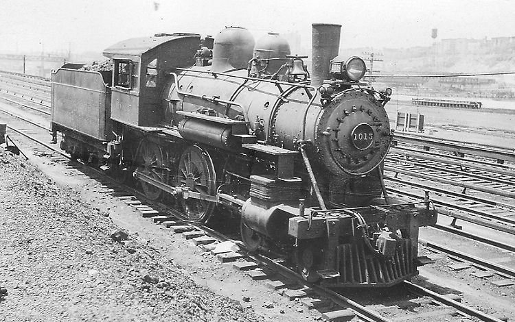 The 4-4-0 or American Standard type was the most numerous of all steam engines during the 1800s, but by the 1930s the vast majority had been retired. No. 1015, shown in the Bronx, New York in 1934, was scrapped the following year. She was a member of class C (the former class I), built by Schenectady in 1890 and rebuilt in 1905. Dimensions given for this class include 78-inch drivers, 19x24-inch cylinders, and 180 p.s.i. of boiler pressure. As rebuilt, they weighed 125,000 pounds and produced a tractive force of about 17,000 pounds.