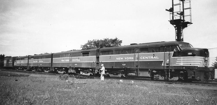 Another view of the previous subject offers a broadside of the entire four-unit combination of ALCo-GE F units. Lead A unit 1018 is trailed by B units 3333 and 3334 and A unit 1036. The 1500-horsepower A units, delivered in 1947, were classed DFA-3; the 1600-horsepower B units were delivered in 1951-52 and classed DFB-7.