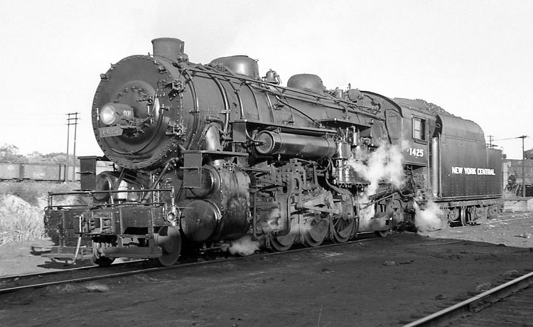 Unlike many members of the NYC System's large H-5 class, Mikado No. 1425 was not rebuilt from a class G-5 2-8-0 but came new from Lima Locomotive Works in 1916 as No. 3980, being renumbered to 1480 in 1936. In 1940 she was transferred to the Boston & Albany as No. 1225. With dieselization of the B&A she was returned to the NYC roster in 1951 and assumed her final number. Her career there was brief, however, as she was sold for scrap the following year. Specifications for members of class H-5t were virtually identical to those of the rebuilt H-5p class, shown for No. 1351, except that the B&A's group weighed 266,000 pounds. The Delta trailing truck suggests that No. 1425 may have had a booster adding 9900 pounds of tractive effort. William D. Volkmer, by way of Wayne Koch, supplied this image of No. 1425 taken at Selkirk, New York probably soon after the locomotive's renumbering.