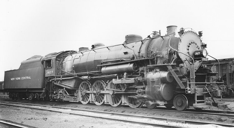 Paul Eilenberger captured this image of No. 2627, a member of the L-1c class, at Newbury Junction, Pennsylvania on April 18, 1946. The photo, from the collection of William A. Raia, came to our New York Central Collection via an eBay purchase. Members of class L-1c were Lima products of 1918; their dimensions were similar to those of the earlier L-1 classes (see the commentaries for Nos. 2545 and 2560). Though originally hand-fired and with a fabricated trailing truck, most of the L-1s (like No. 2627) received Duplex stokers, booster-equipped trailing trucks, and feedwater heaters — in 2627's case, the Coffin type. They featured the Walschaerts valve gear, unlike NYC's later Mohawks that had the Baker gear. In later service many L-1s were assigned to the NYC's Pennsylvania Division, as in this example. Records indicate that this locomotive was retired and cut up in 1950.