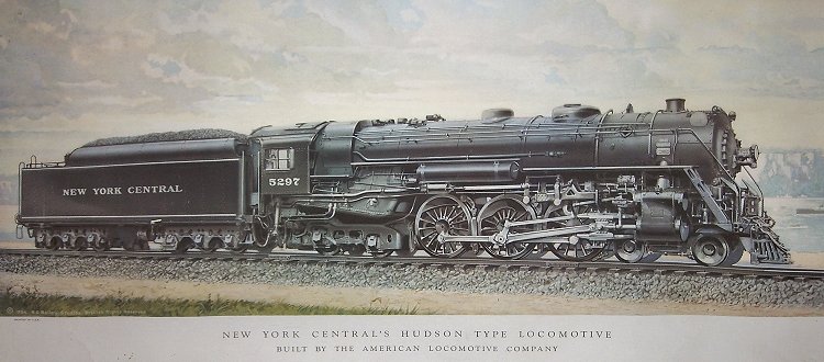 Locomotive builders during the heyday of steam were aggressive about publicity, one form of which was the distribution of large framed photographs or illustrations of their products. In 1934 the American Locomotive Company issued this print of the New York Central's J-1d class of Hudson type locomotives, a creation of the H. O. Bailey Studios. No. 5297, the subject of this illustration, came off the ALCo erecting floor in 1930 and was retired in 1954. For the specifications of the J-1d class, see the commentaries on Hudsons 5367 and 5379. Janet Kerr contributed this image to our Collection. The framed print, which measures 32x17 inches, was owned by her father, Harry A. W. Vohs of Janesville, Wisconsin, a mail worker on passenger trains between Chicago and St. Paul. Click here for a larger version.