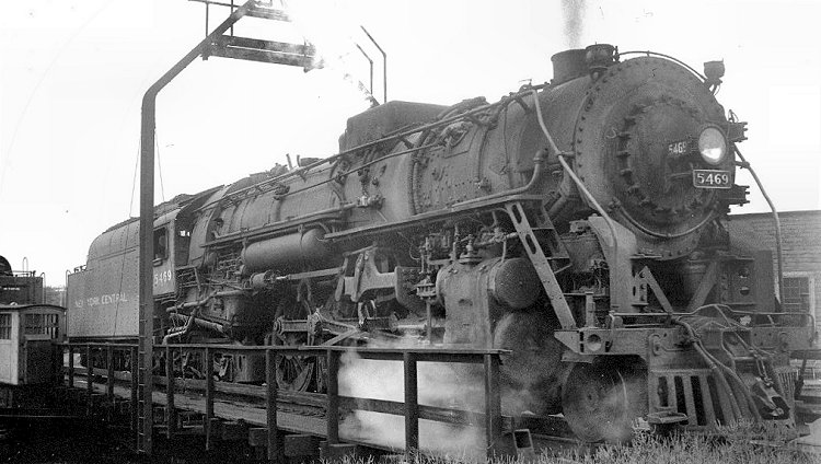 With dieselization of the Boston & Albany, its fleet of 20 class J-2 Hudsons was transferred to service out of North White Plains, New York, to Brewster and Chatham, and also to New York City suburban service on the West Shore line out of Weehawken, New Jersey. In these assignments they continued to serve for several years. In 1951 they were renumbered into the New York Central series as Nos. 5455-5474. William D. Volkmer snapped No. 5469, delivered by Lima in 1931 as B&A No. 614 in class J-2c, on the turntable at Chatham, New York, on August 31, 1952. Sources indicate she was sold for scrap a few months after this photo was taken. The J-2s on the West Shore were given twelve-wheeled tenders from retired J-1 4-6-4s, but those on the line to Chatham retained the original short B&A eight-wheeled tender; otherwise they would not have been able to fit on the turntable at North White Plains.