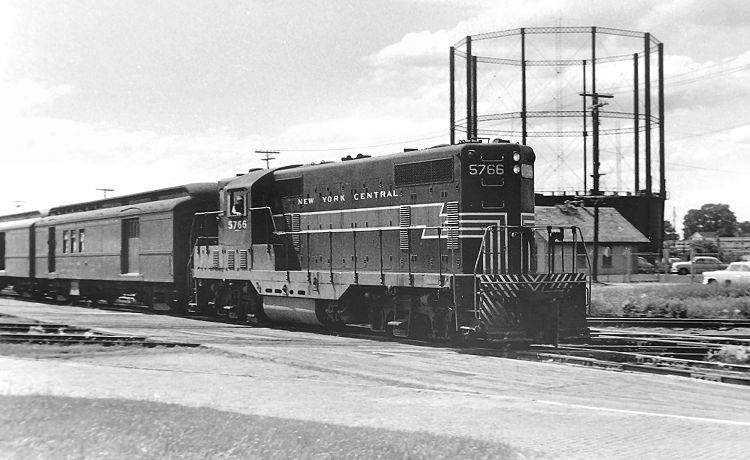 EMD GP-7 No. 5766 brings the Peoria & Eastern's eastbound Corn Belt Special, train No. 12, across the Gulf, Mobile & Ohio diamond in Bloomington, Illinois, in this scene from June 1957. The train is making its stop at the GM&O station, the only Bloomington stop since the New York Central's P&E line abandoned its own passenger depot near Main Street in 1950. (My 1947 NYC timetable still shows a stop at the old location as well as here, then called "Alton Crossing" by the P&E.) Note the NYC practice of running GP-7s and other road switchers with the long hood first. I beat this train across town and snapped it again approaching Dean Tower.