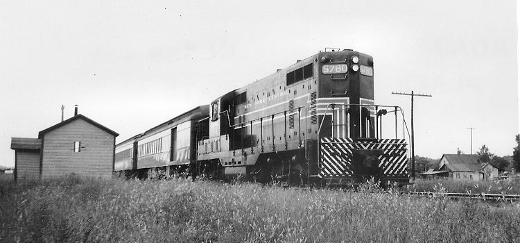 In this scene from August 1954, GP-7 No. 5780 stops at Vanderbilt, Michigan with the southbound Timberliner, train No. 336. The Timberliner, accommodating vacationers from Detroit to Mackinaw City and Mackinac Island, operated only on summer weekends. The northbound train ran on Friday and the southbound train on Sunday. By the early 1960s passenger service on the Mackinaw City line had been discontinued north of Bay City, which was still served from Detroit by a "Beeliner," the New York Central's name for a Budd RDC (self-propelled rail diesel car) until March, 1964.
