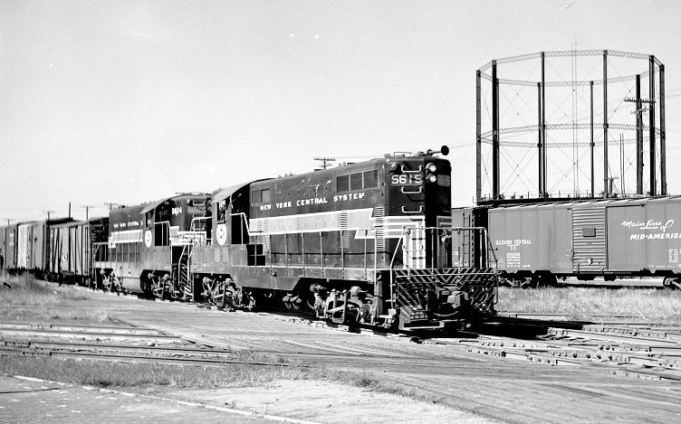 Peoria & Eastern GP-7 units 5615 and 5624 bring an eastbound freight across the diamonds of the Gulf, Mobile & Ohio's line to Jacksonville, approaching the crossing of the GM&O main line at Bloomington, Illinois. My brother, David V. Leonard, snapped this view in October 1957.